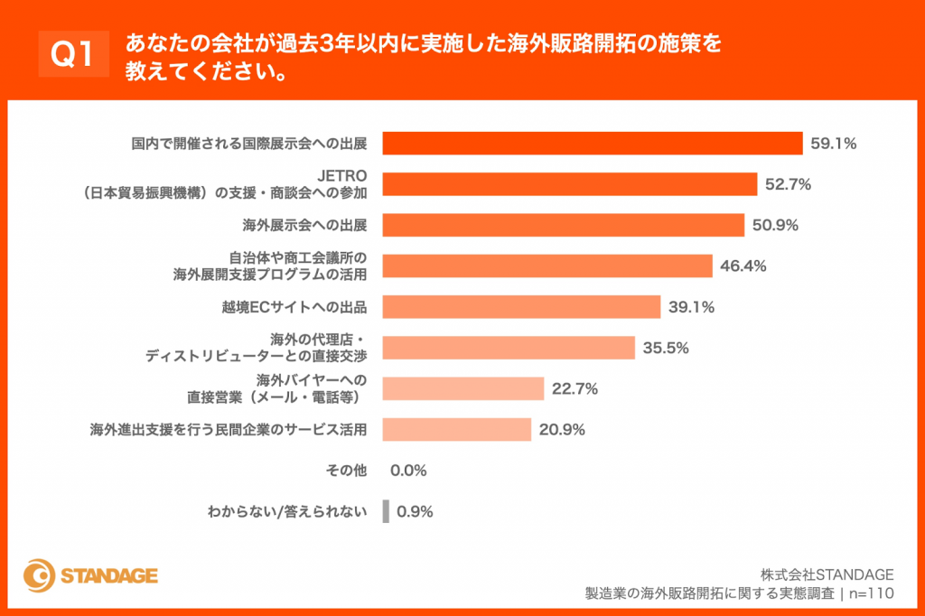 「Q1. あなたの会社が過去3年以内に実施した海外販路開拓の施策を教えてください。(複数回答)」(n=110)と質問したところ、「国内で開催される国際展示会への出展」が59.1%、「JETRO(日本貿易振興機構)の支援・商談会への参加」が52.7%、「海外展示会への出展」が50.9%The answer was: