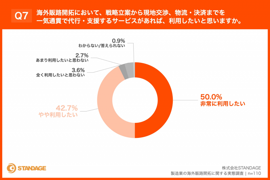 「Q7. 海外販路開拓において、戦略立案から現地交渉、物流・決済までを一気通貫で代行・支援するサービスがあれば、利用したいと思いますか。」(n=110)と質問したところ、「非常に利用したい」が50.0%、「やや利用したい」が42.7%The answer was: